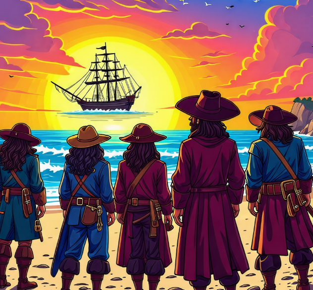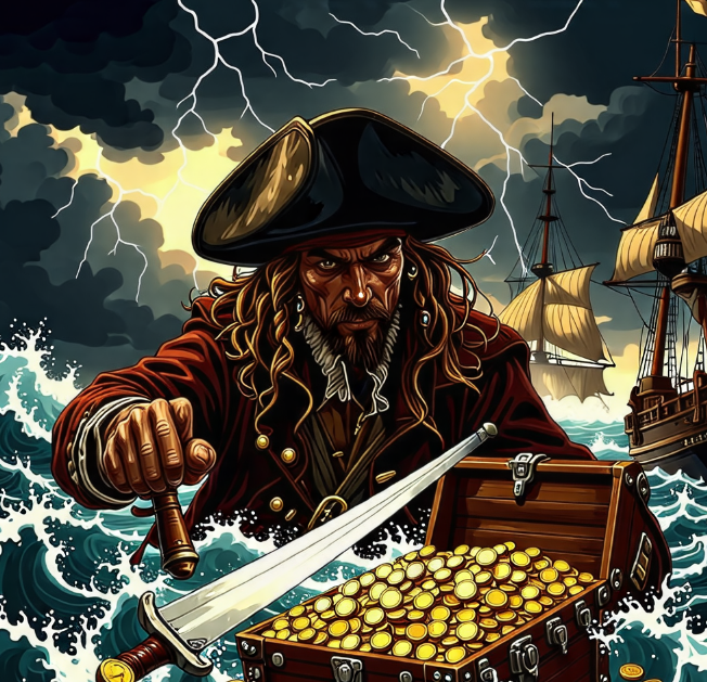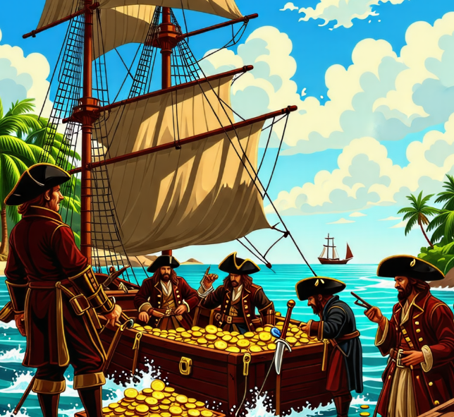 반짝이는 금화, 커다란 해적선, "야호~!" 하고 외치는 해적들!