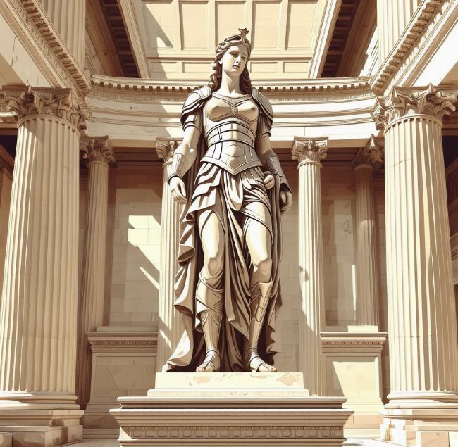– 한 손에는 승리의 여신 니케, 다른 손에는 방패와 창