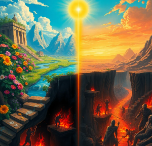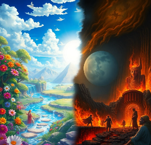 금으로 된 길, 천사들의 노래, 그리고 고통 없는 평화가 약속된 곳. - 지옥(Hell) – 반대로 죄를 짓고 참회하지 않은 자가 가는 곳.