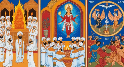 → 선하고 진실하며, 세상을 질서 있게 창조한 존재. - 그에 반해 앙그라 마이뉴(Angra Mainyu)라는 악의 힘도 존재해.