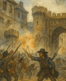 결국 어느 순간, 누가 먼저 쐈는지도 모를 총소리가 울렸어. 이게 결정적이었어. 전면전으로 번졌고, 시민들은 사다리로 벽을 오르고, 해체한 대포를 끌고 와서 공격했어. 몇 시간의 격전 끝에, 바스티유 지휘관이 백기를 들었고, 감옥은 시민들의 손에 넘어갔어.